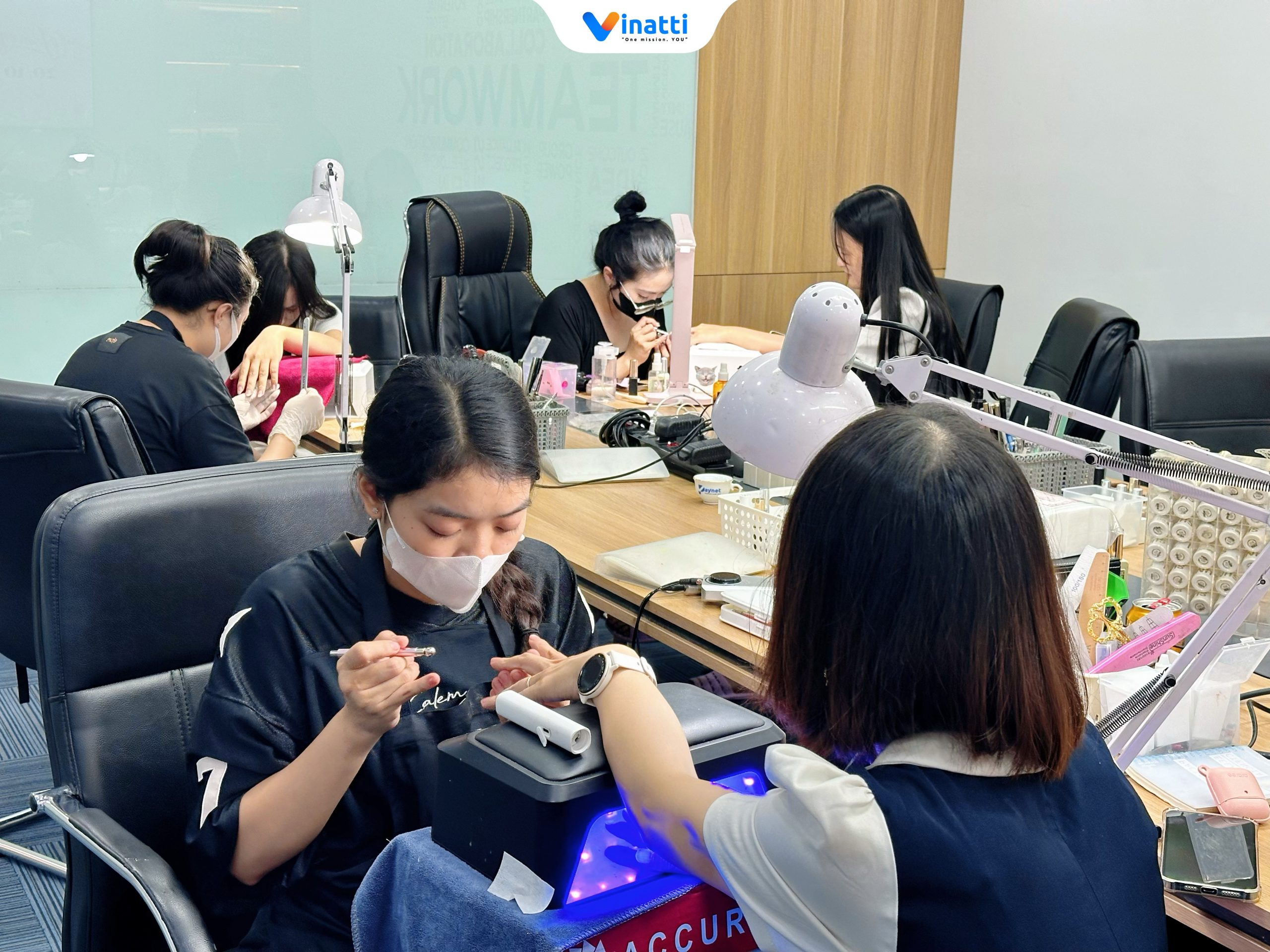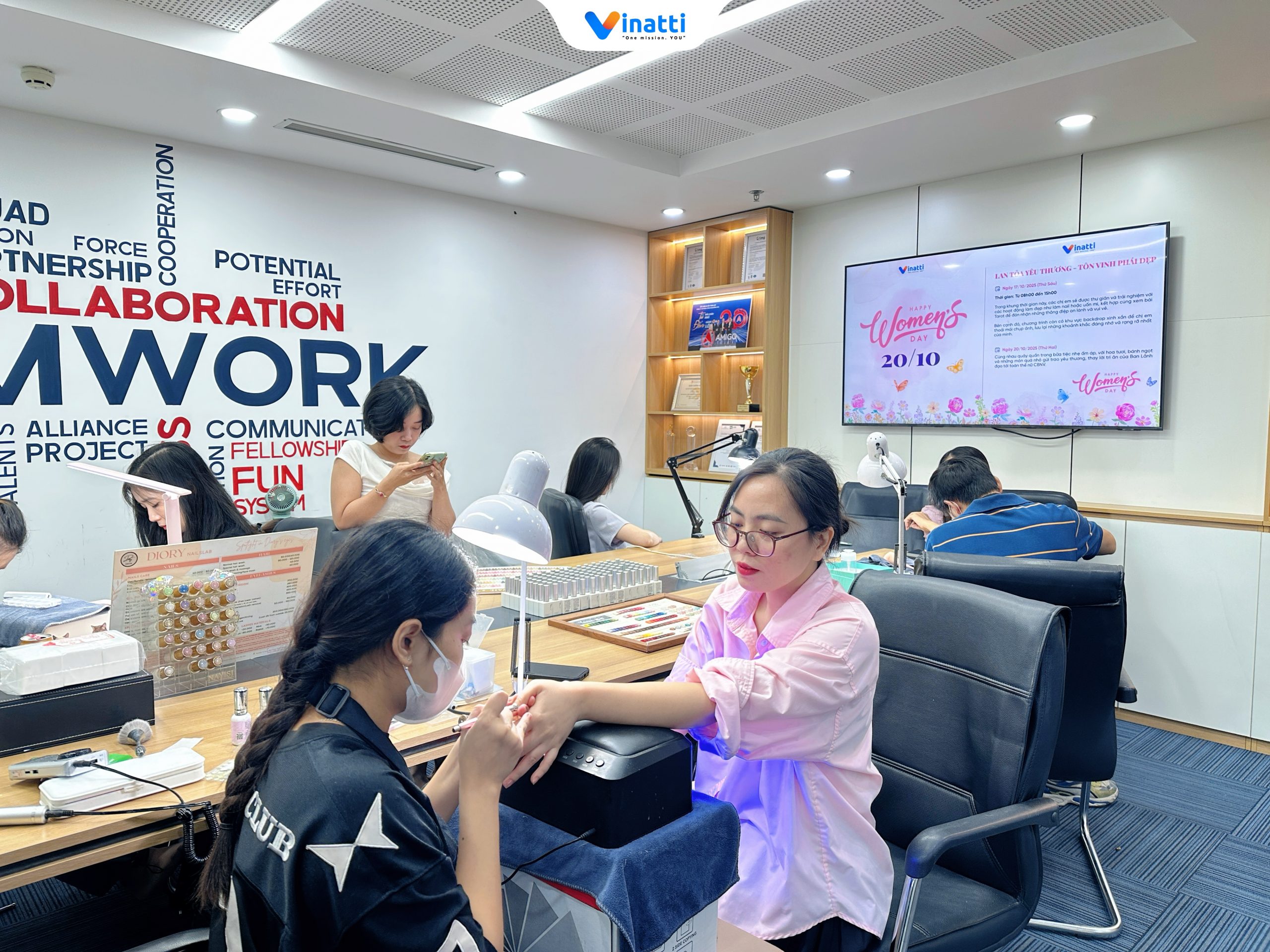 Một trong những điểm nhấn của chương trình là hoạt động “Chăm sóc sắc đẹp – Tôn vinh phái nữ, rạng rỡ tự tin”. Các chị em đã được trải nghiệm dịch vụ làm nail sơn gel nghệ thuật và uốn mi chuyên nghiệp, giúp tôn lên vẻ đẹp tự nhiên và mang lại cảm giác thư giãn sau những giờ làm việc.